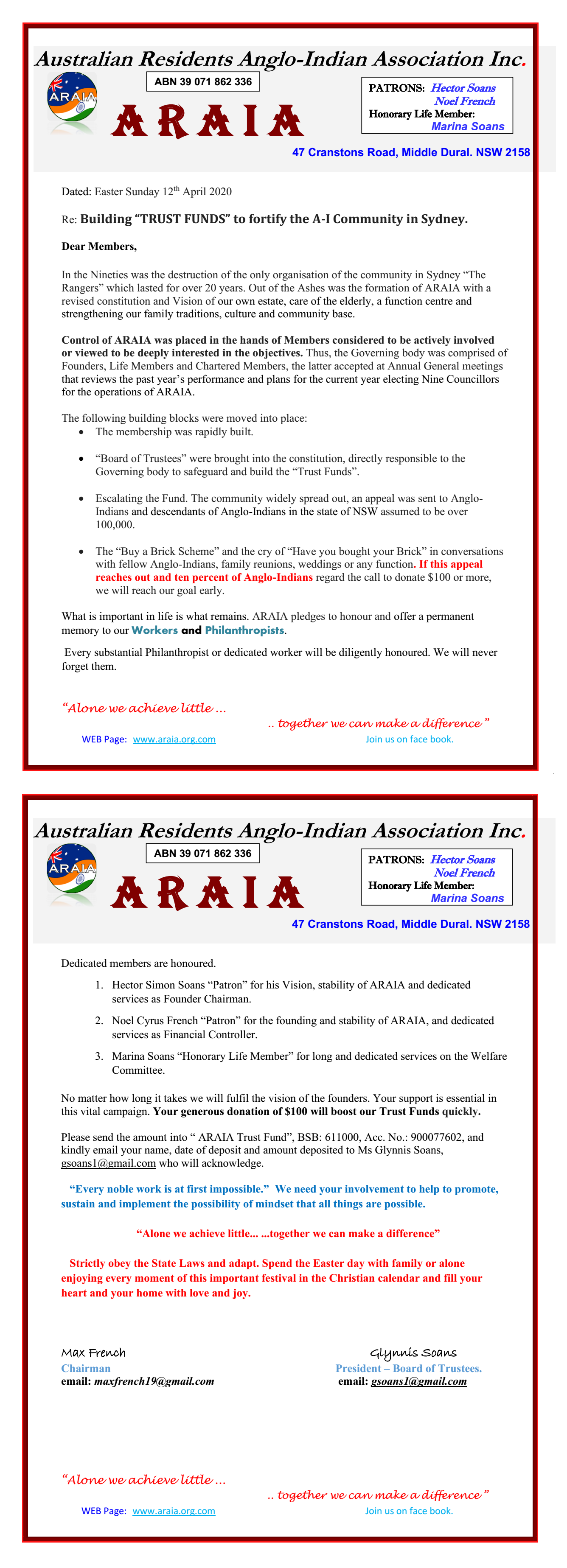 The Australian Residents Anglo Indian Association Inc (ARAIA) was formed (in Sydney) in September 1995. The Association holds regular Social, Sporting and other activities where members can meet others who have migrated to Australia.